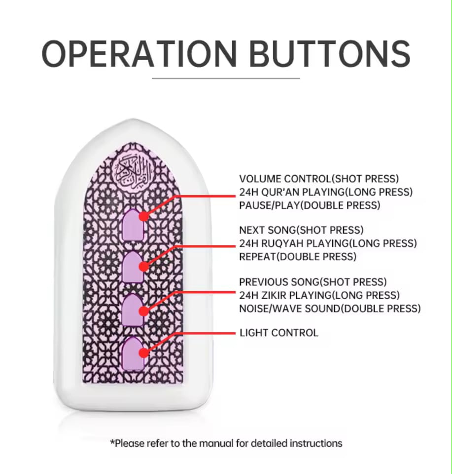 ৫. রুকইয়া (শিশুদের সুরক্ষা সম্পর্কিত) আয়াত শুনতে ৩ নং বাটন শর্ট প্রেস করুন।